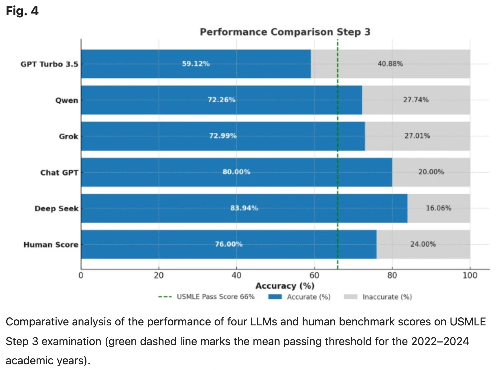 Spróbujmy zatem zastosować te same standardy sprawdzania wiedzy u ludzi, jak u chatów: każmy LLM-om zdawać lekarskie egzaminy końcowe. Zdany egzamin gwarantuje dyplom i prawo wykonywania zawodu.* Jak AI-owi poszło zdawanie amerykańskich egzaminów lekarskich? Według badania z grudnia 2025: decydowanie lepiej niż niejednemu studentowi. Większość modeli dostałaby dyplom lekarza, a model Deep Seek osiągał skuteczność od 84 do 93%. (2)